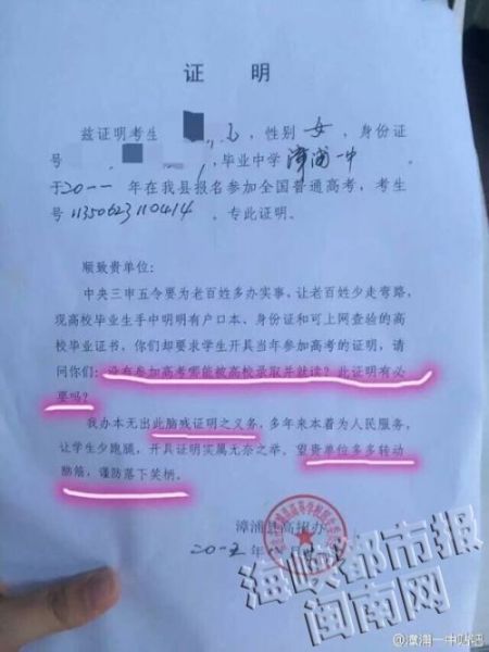 前天傍晚6点多,一份奇葩证明在漳浦的微信圈里传播。这份证明分上下两部分,盖章单位是漳浦县教育局高招办。证明写明漳浦一中一女考生于2011年,在当地参加全国高考,出具考生号。而在证明下半部分,漳浦县高招办对开具必要性提出两点质疑:高校毕业生手中有户口本、身份证,高校毕业证书也可网上查验,为何还要学生开具当年参加高考的证明?没有参加高考,哪能被高校录取并就读?